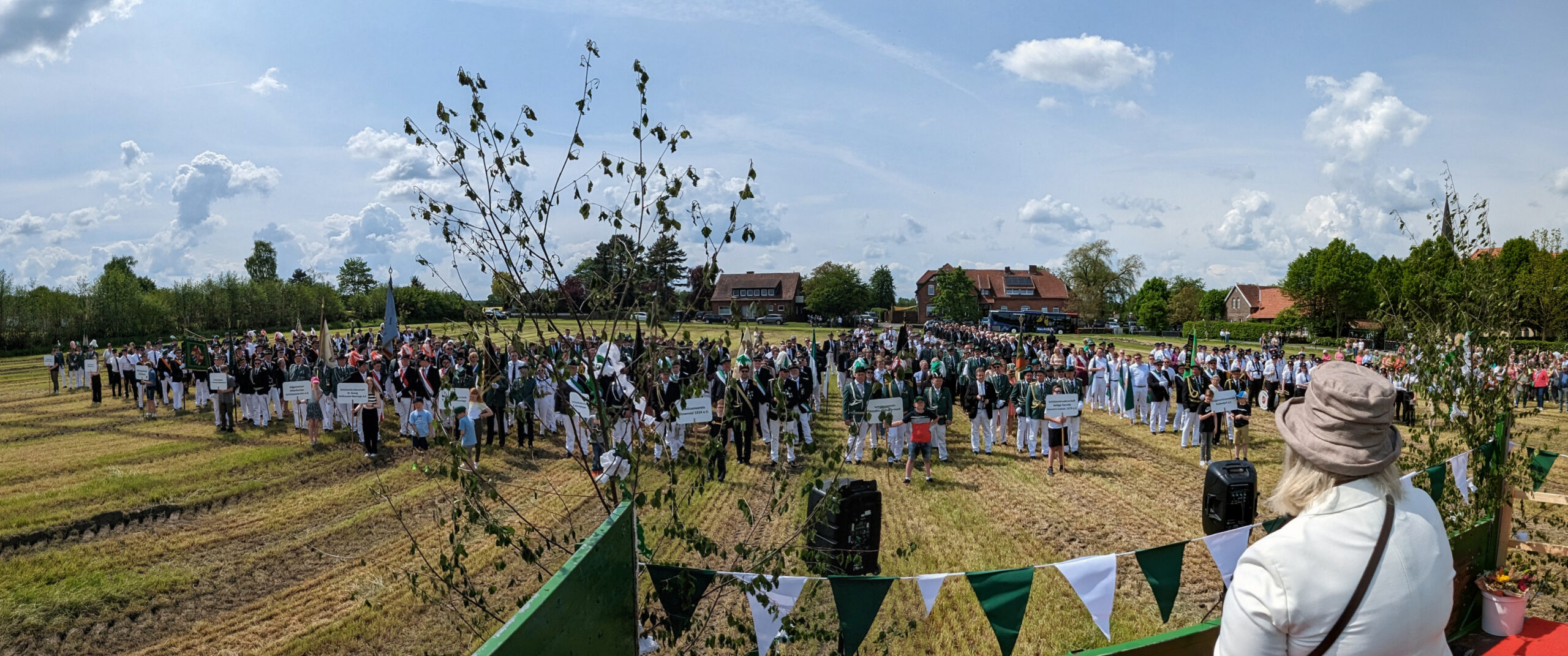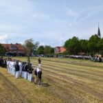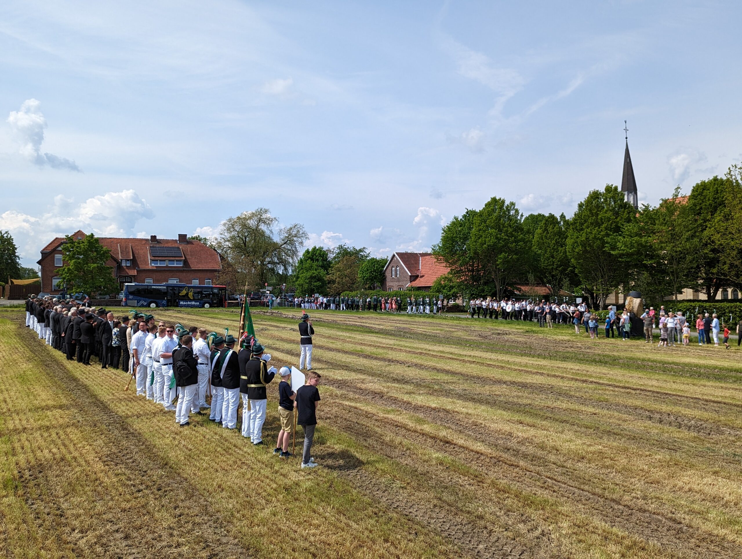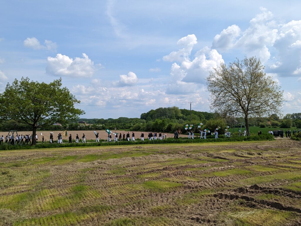Am Sonntag versammelten sich die Vereinsmitglieder wieder ab 11 Uhr zum Frühschoppen im Festzelt, wo mit Spannung auf den anstehenden Sternmarsch gewartet wurde. Wie in 1998 sollten sich die elf Gastvereine aus vier Richtungen mit je einer Musikkapelle unserem Festplatz nähern. Als Startpositionen wurden die Höfe Gröwer, Mensing und Große Ostendorf sowie die Kreuzung bei Hölker (Prominentenkurve) ausgewählt, wo sich die Gastvereine ab 13 Uhr trafen und vom Orga-Team mit kühlen Getränken versorgt wurden.