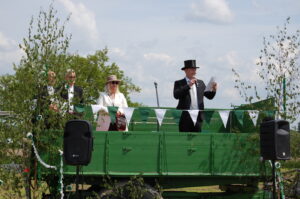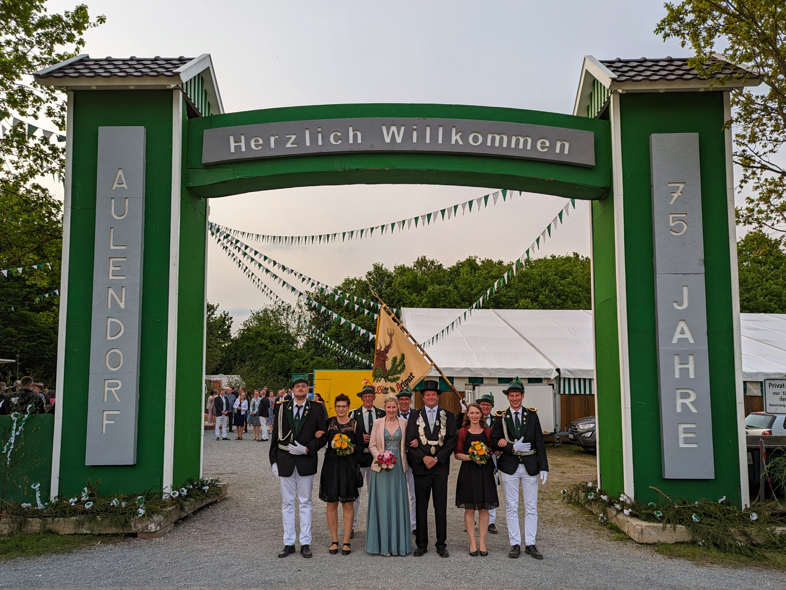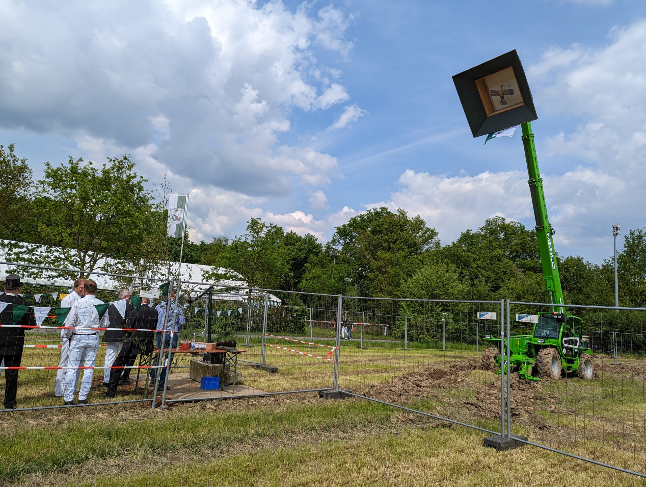 Schon Wochen vor dem Fest begannen die ersten Aufbauarbeiten, bei denen sich das Orga-Team sowie viele weitere Vereinsmitglieder aktiv beteiligten. So wurde zum Beispiel unser Schießplatz bei Arning komplett renoviert und mit einem neuen Eichengeländer versehen. Auch ein großer Jubiläumstorbogen wurde geliehen, der die Einfahrt zum Festplatz schmücken sollte, an welchem aber noch einige Arbeiten zu erledigen waren, damit er zum Jubiläum glänzen konnte. Auch für das Kaiserschießen auf der Wiese nebenan mussten Genehmigungen und Gutachten eingeholt und Sicherheitszonen mittels Zaun abgegrenzt werden.