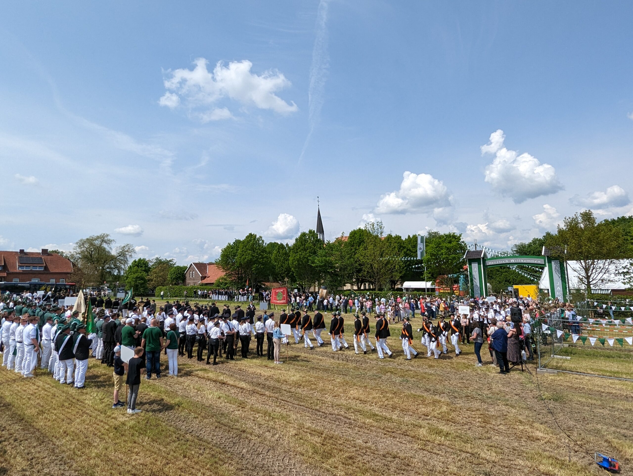 Die letzten Feinheiten konnten am Freitag vor dem Jubiläumsfest erledigt werden, so dass am Samstag pünktlich mit dem Schützenfest begonnen werden konnte. Glücklicherweise hatte sich das Wetter zum Guten gewandelt und belohnte die viele Arbeit mit einem blauen Himmel und viel Sonne. Diese war auch bitter nötig, denn der Aufmarschplatz nebenan war durch den vielen Regen komplett aufgeweicht.